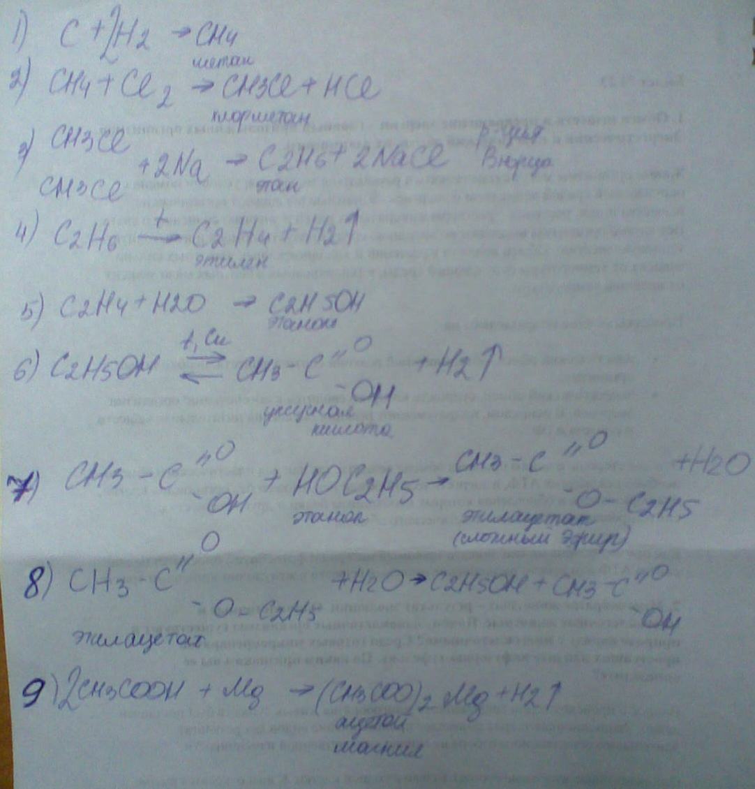 C --> CH4 --> CH3Cl --> C2H6 --> C2H4 --> C2H5OH --> CH3COOH --> CH3COOC2H5 --> CH3COOH --> (CH3COO)2 Mg