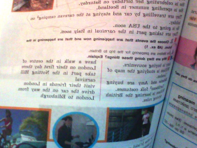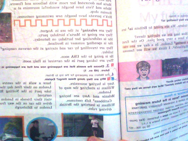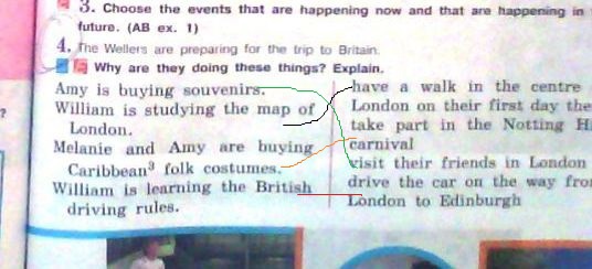 1. Amy is buying souvenirs. – She visit their friends in London. 2. William is studying the map of London. – He has a walk in the centre of the London. 3. Melanie and Amy are buying Carribean folk songs. – She takes part in the Notting Hill Carnival. 4. William is learning the British driving rules. - He drive the car on the way from London to Edinburgh.