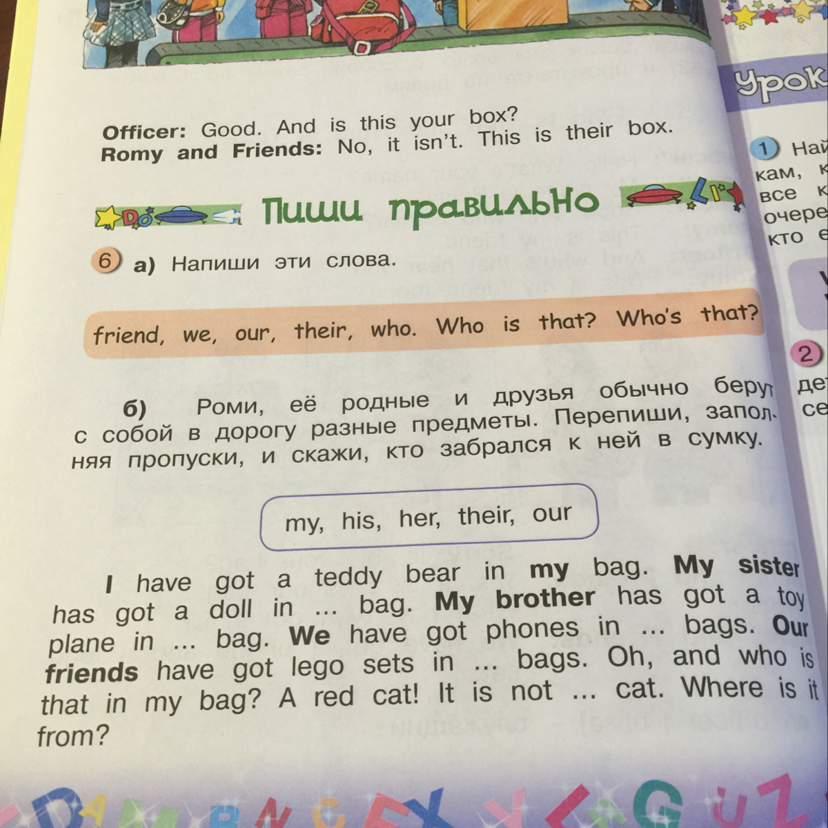 Роми,не родные и друзья обычно берут с собой в дорогу разные предметы.Перепиши,заполняя пропуски,и скажи,кто забрался к ней в сумку.