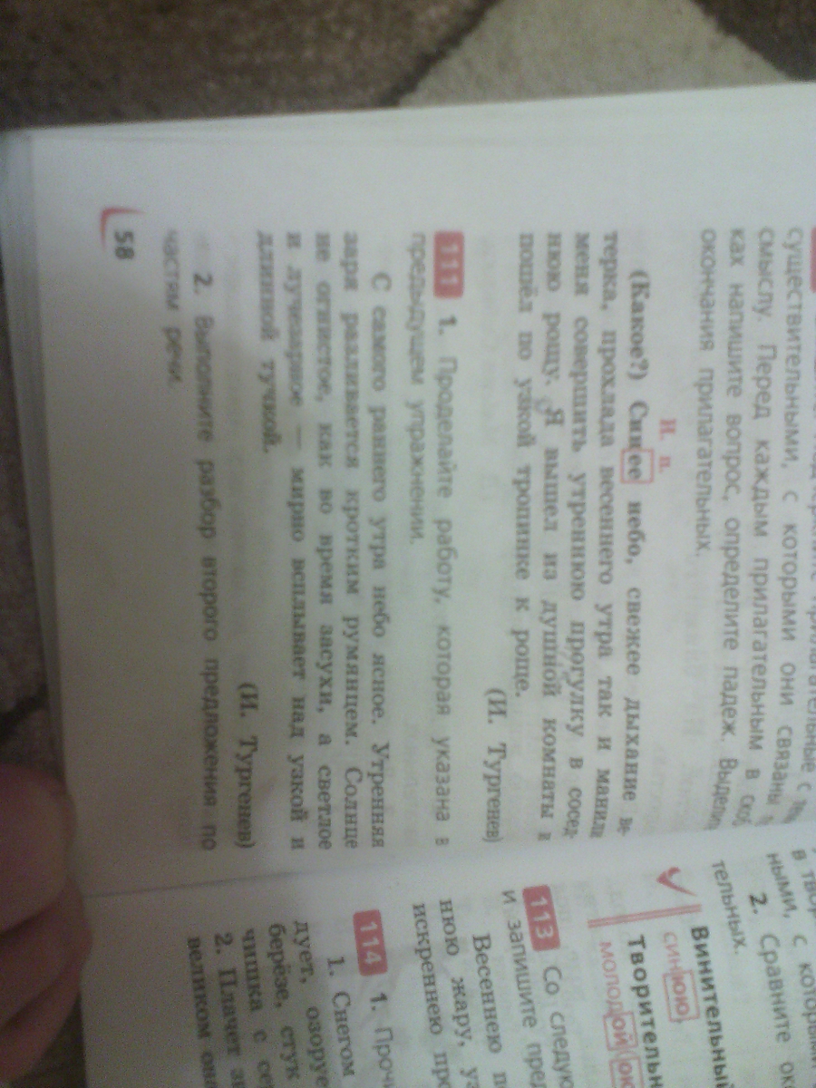 ясное(и.п.),кротким(т.п.),огнистое(и.п.),светлое(и.п.),лучезарное(и.п.),узкой(т.п.),длинной(т.п.),