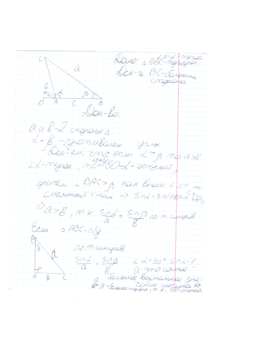Докажите , что если в треугольнике лежит неострый угол, то против него лежит наибольшая сторона.