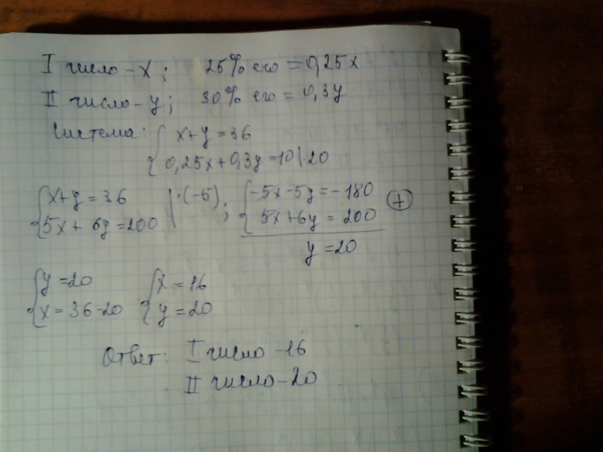 сумма двух чисел равна 36 , а сумма 25% первого числа и 30% второго числа равна 10. Найдите эти числа