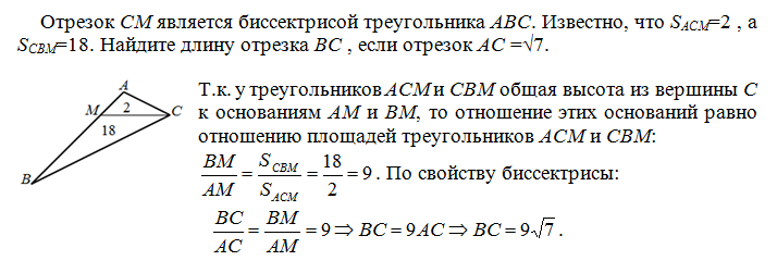 Помогите , Отрезок CM является бисектрисой треугольника ABC . Известно что Sacm=2 , a Scbm=18 , . Найдите длину отрезка BC , если отрезок AC =√7