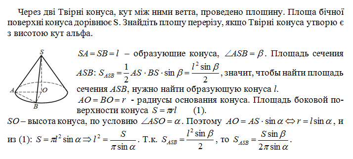 Через дві Твірні конуса, кут між ними ветта, проведено площину. Площа бічної поверхні конуса дорівнює S. Знайдіть площу перерізу, якщо Твірні конуса утворює з висотою кут альфа.