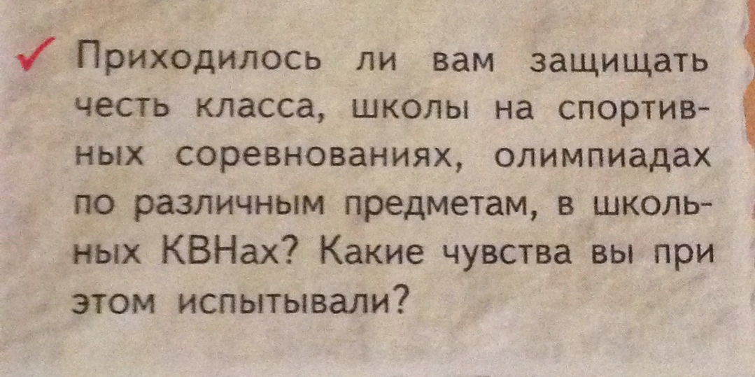 / Приходилось ли вам защищать честь класса школы на испортив юных соревнованиях олимпиадах по различным предметам в школ юных Какие чувства вы при этом испытывали
