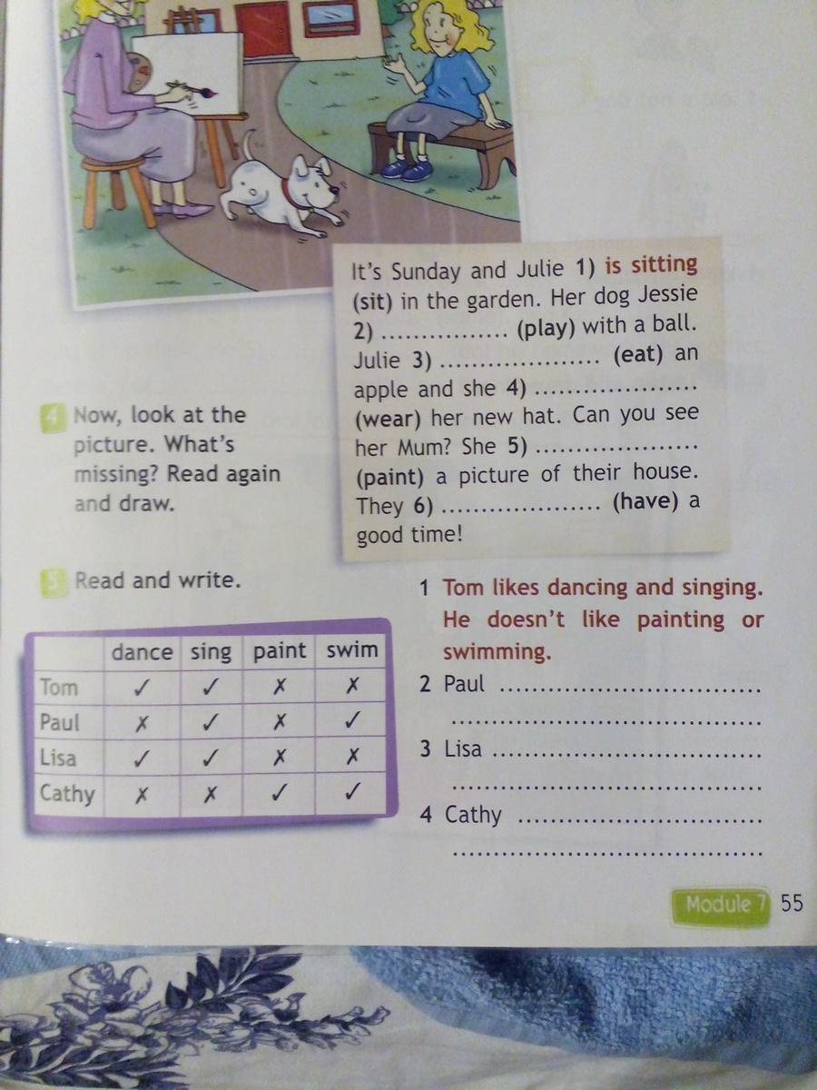 3)Lisa likes dancing and singing. She doesn't like painting and swimming.