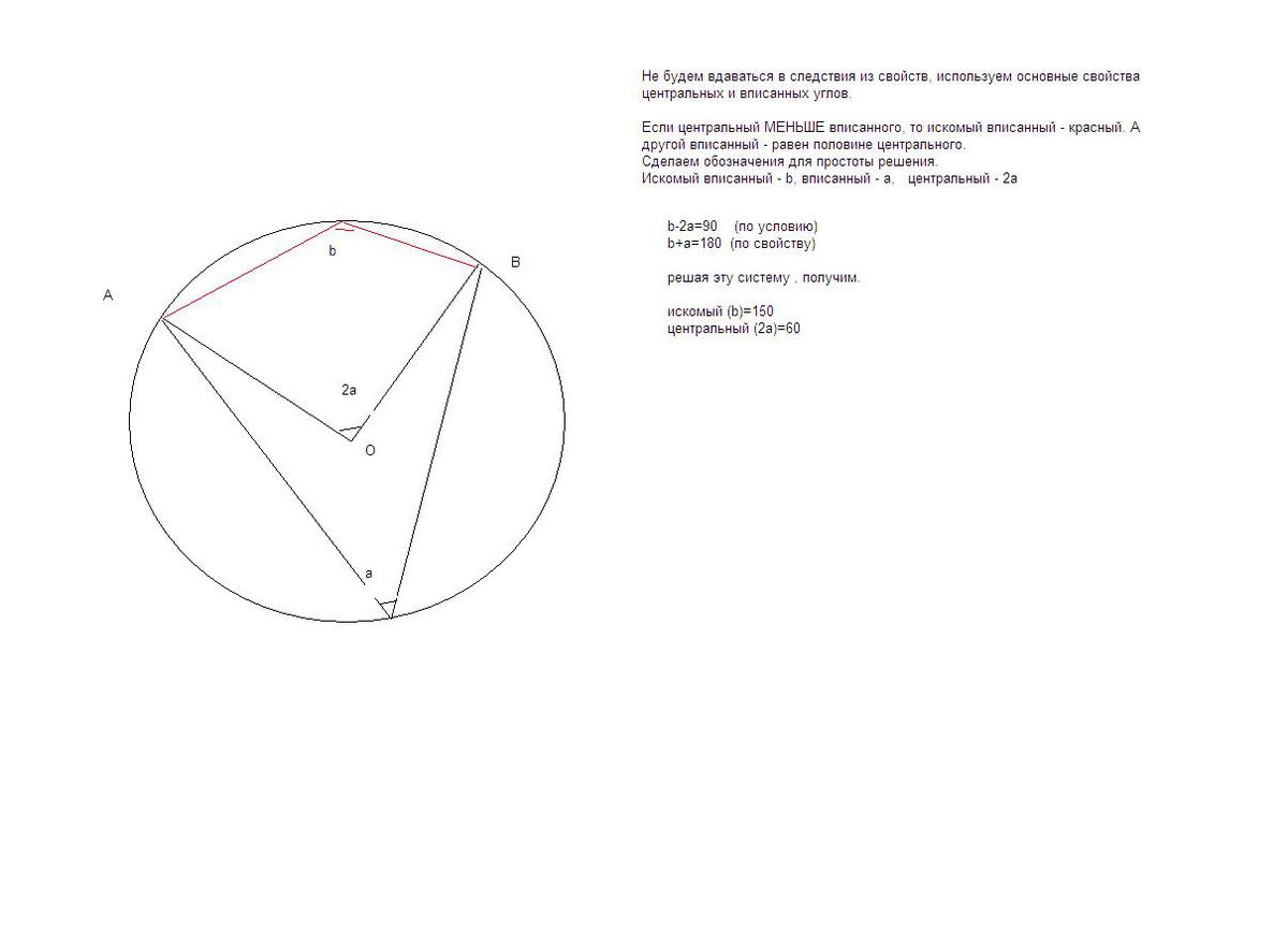 Центральный угол АОВ на 90 градусов меньше вписанного угла, опирающегося на дугу АВ. Найдите каждый из этих углов