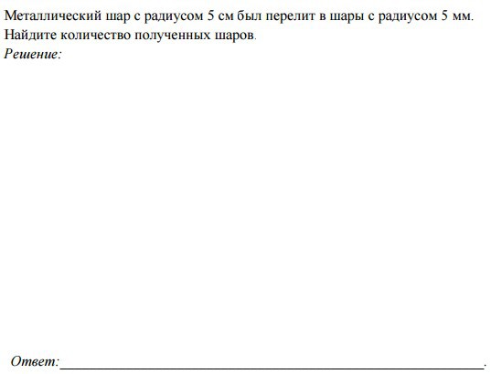 Металлический шар с радиусом 5 см был перелит в шары с радиусом 5 мм.