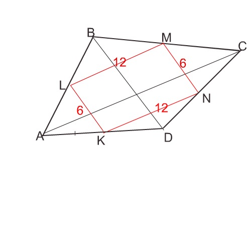 В выпуклом четырехугольнике ABCD отмечены точки K, L, M и N - середины сторон AD, AB, BC и CD соответственно. Расстояние между точками K и L равно 6, между точками K и N - 12. Найдите периметр четырёхугольника KLMN.