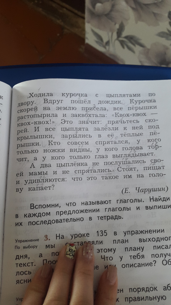 Есть три типа речи: повествование, описание, рассуждение. Этот текст-повествование описывает последовательные действия курочки и цыплят (ходят курочка с цыплятами по двору, пошёл дождик, курочка присела, растопырила пёрышки, заквохтала, цыплята залезли под крылышки, два цыплёнка не послушались, стоят, пищат). Об этих событиях рассказывается в их временной последовательности. Это подтверждает, что текст является повествованием.