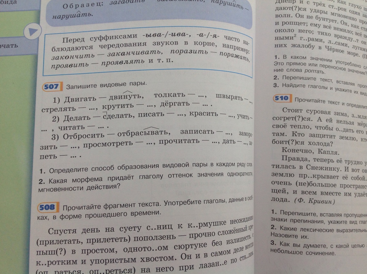 1.двигать-двинуть,толкать- толкНУть,швырять-швырНУть,стрелять- стрельНУть,крутить-крутаНУть,дергать-дерНУть.Суффиксальный способ словообразования