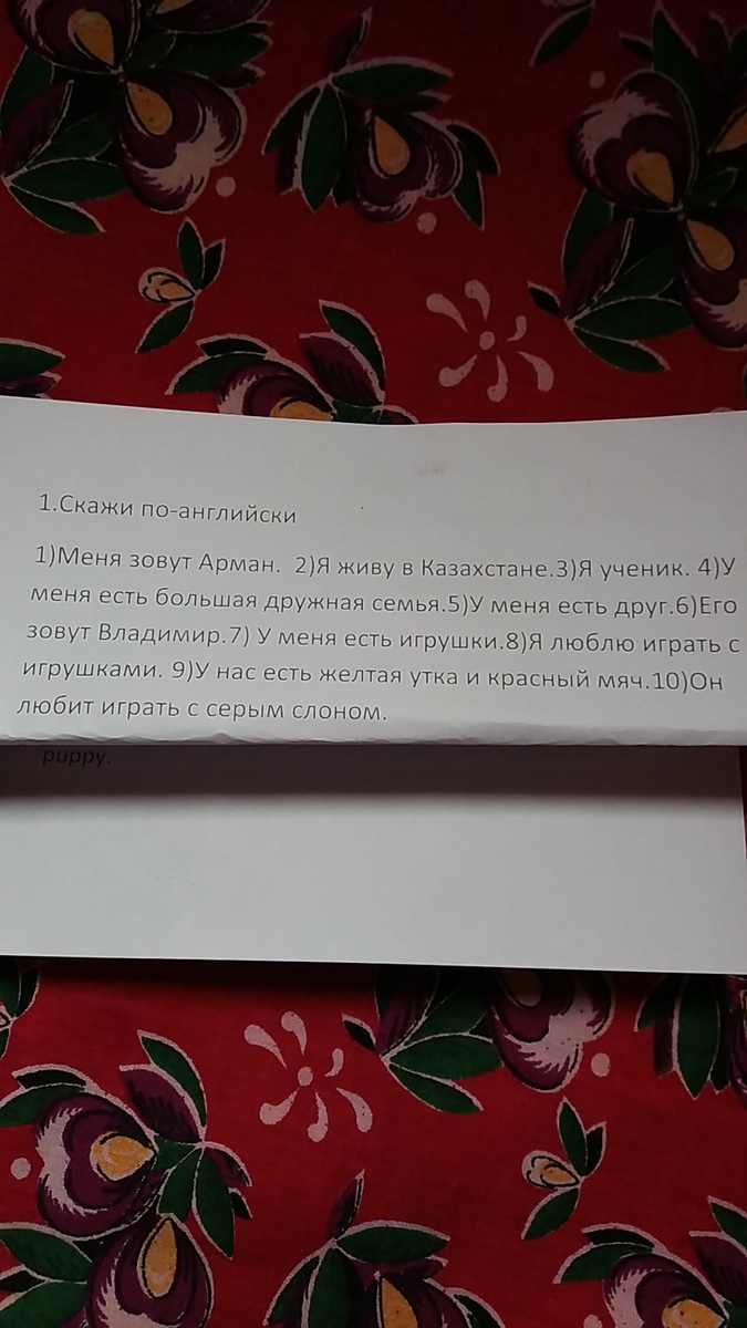 My name is Arman. I live in Kazahstan. I am a pupil. I have a big, friendly family. I have a friend. His name is Vladimir. I have toys. I like to play with toys. We have a yellow duck and a red ball. He likes to play wuth the grey elephant.
