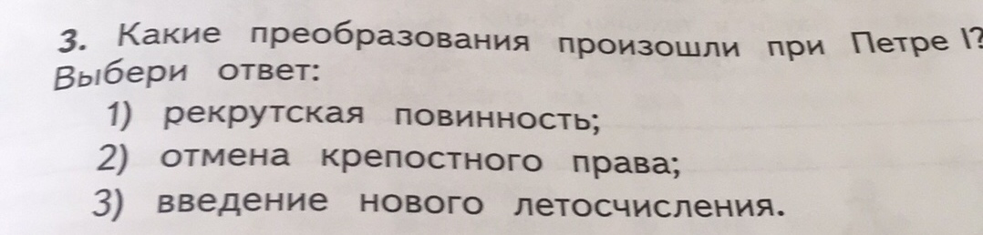 3. Какие преобразования произошли при Петре п Выбери ответ 1) рекрутская повинность 2) отмена крепостного права 3) введение нового летосчисления