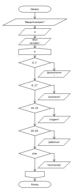 написать программу в Pascal и составить её блок -схему: по возрасту, введённому с клавиатуры, определить, к какой возрастной группе относится человек: от 0 до 7 лет дошкольник. от 8 до 17 лет школьник, от 18 до 23 лет студент, 24-55 лет работник, от 56 лет и старше пенсионер.