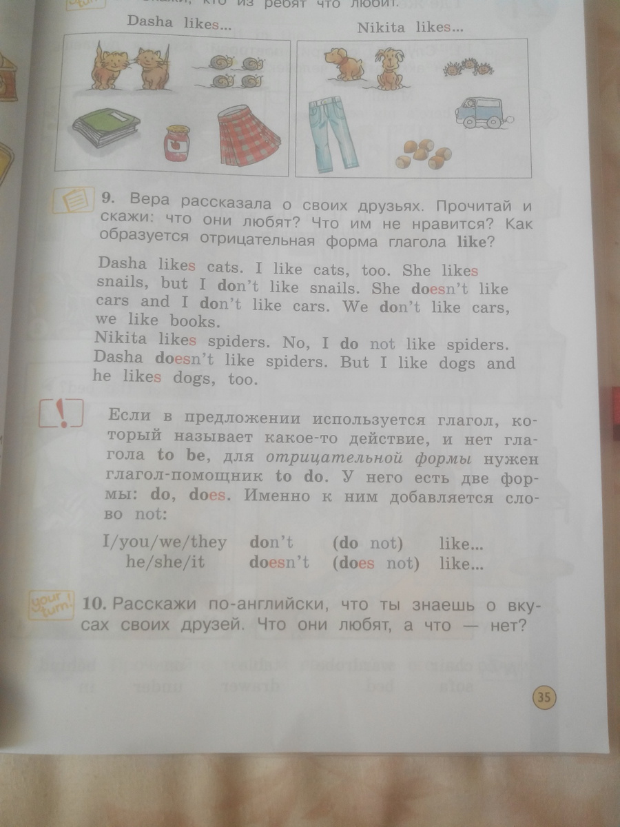 Даша любит кошек. Мне тоже нравятся кошки. Ей нравятся улитки, но я не люблю улиток. Ей не нравятся машины, и мне не нравятся машины. Мы не любим машины, мы любим книги.