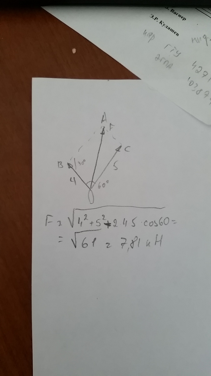 Она равна √(Т₁² + Т₂² + 2T₁T₂cosα) = √(16+25+20) ≈ 7,81 Н.