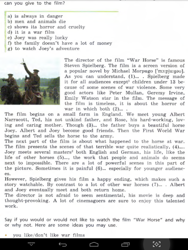 Режиссёр фильма «Боевой Конь» - знаменитый Стивен Спилберг. Фильм является экранизацией популярного романа Майкла Морпурго. Как вы можете понять, этот фильм о войне. Спилберг сделал его для широкой аудитории, за исключением детей в возрасте до 13 лет, из-за присутствия в фильме сцен насилия. В главных ролях снимаются такие актёры, как Питер Маллан, Джереми Ирвин, Эмили Уотсон. Идея фильма бессмертна, она повествует об ужасе войны, на которой погибают и люди и животные.