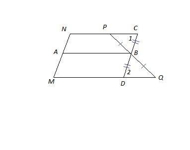 На рисунке AB параллельна NC, точка B - середина отрезков DC и PQ. Докажите, что AB параллельна MQ. Доказательство. 1) треугольник BCP = треугольнику BDQ по ______________________________________________________________________________________________________