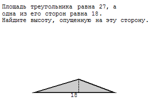 Площадь треугольника равна 27, а одна из его сторон равна 18.Найдите высотку , опущенную на эту строну