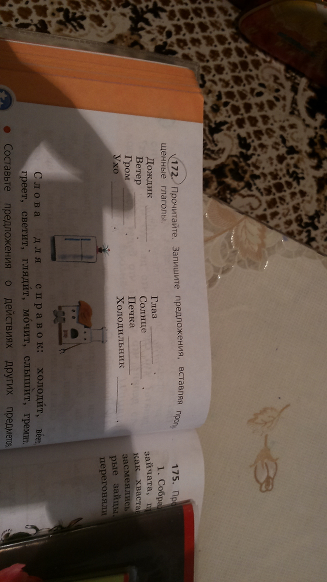 Дождик мочит, ветер веет, гром гремит, ухо слышит, глаз глядит, солнце светит, печка греет, холодильник холодит.