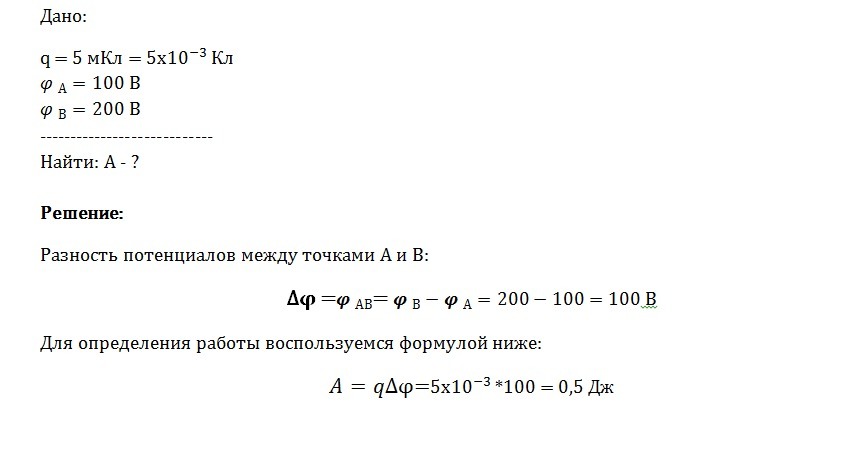 Потенциал в точке А электрического поля равен 100 В,потенциал в точке В равен 200 В.Какую работу совершают силы электрического поля при перемещении заряда 5мКл из точки А в точку В?
