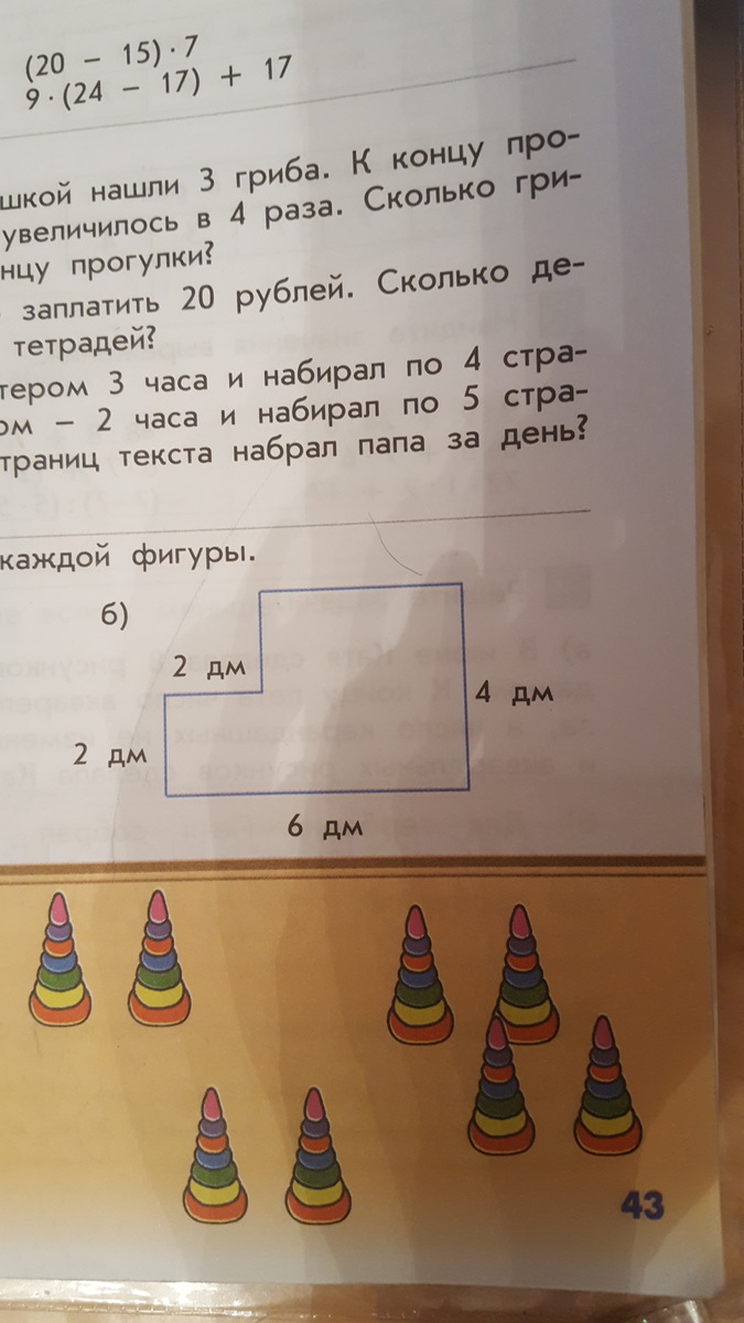 Достраиваешь до прямоугольника,тогда периметр будет (4+6)*2-2*4=12дм, а площадь будет равна (4*6-4)=20дм^2