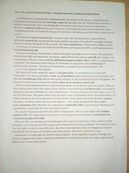 Государственная система Великобритании racyAapcrueHHbrw ycrpo Bennxo6purannn в Великобритании является парламентская монархия (1) Сила королевы ограничена написано это означает, что суверенные царствует (2), но не исключает Британии нет конституции, но комплект oflaws t3) Парламент является самым важным органом в Великобритании она включает (а) Палата общин, палата и конституционная роль Монар в действительности Палата общин только один из Thr, который имеет истинный монарх служит формально ( 5) в качестве главы государства. Но монарх как ожидается, будет нейтральным и не должны принимать политические решения. Настоящий повелитель Великобритании королевы Елизаветы (вторая). Она была коронована (7 н Вестминстерское аббатство в 1953 году Палата общин имеет 650 избранных членов парламента (депутаты), каждый из которых представляет собой местный избирательный округ (8) Они избираются тайным голосованием. Generalelections проводятся каждые пять лет страна делится на 650 избирательных округов. Все граждане в возрасте от 18 лет, имеют право голоса (9), но голосование не является обязательным в Великобритании кандидат опроса наибольшее число (10) голосов в избирательном округе избирается. функции Палаты общин законодательства и изучение (11) movernment деятельности. Дом ofCommons возглавляется спикером правительство назначает спикера. е Палата лордов состоит из около 1,200 сверстники (12) Он ispresided над лордом-канцлером Палата лордов состоит из наследственного 13 ) и пэров и peeresses двух архиепископов (14) и 24 самых старших епископов установленной церкви Англии, Палата лордов не имеет реальной власти. Он действует скорее как консультативный совет (IS) Есть несколько политических партий в Великобритании благодаря британской избирательной системе они А.Р. Консервативная партия, Партия труда и Либеральная DemocraticAlliance (16) Каждая nolitical партия выставляет одного кандидата на каждый избирательный округ Тот, кто выигрывает большинство голосов избирается г, что площадь, Сторона, получившая наибольшее количество мест в парламенте, формирует правительство. Это лидер становится премьер-министром В качестве главы правительства премьер-министр назначает министров, из которых около 20 находятся в кабинете старшей группы, которая принимает основные политические решения (17) Министры несут коллективную ответственность 18) для правительственных решений и индивидуальную ответственность за их собственный departmenti Вторая по величине партия формирует официальную оппозицию со своим лидером и теневой кабинет "(19) оппозиция обязан критиковать политику правительства andto представить альтернативную программу (20) новые законопроекты вводятся и обсуждаются в Палате общин если большинство членов е в пользу законопроекта он идет в Палате лордов будет обсуждаться в Доме лордов имеет право отклонить новый законопроект дважды. Но после двух отказов они обязаны принять его и, наконец, счет идет к монарху должен быть подписан. Только тогда она становится законом парламент отвечает за британской национальной политики. Много законодательство распространяется через из Великобритании, Англии и Уэльсе, Шотландии и Северной Ирландии имеют свои собственные правовые системы с различиями в законодательстве и практике. 3AKPbITb