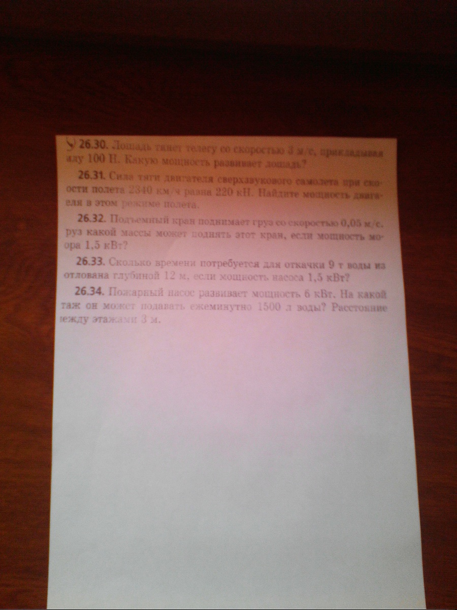 Формула нахождения мощности: N=A/t , так как А=F*S, подставляем в ту формулу вместо А и получаем: N=F*S/t, так как S=V*t, подставляем в предыдущую формулу и получаем: