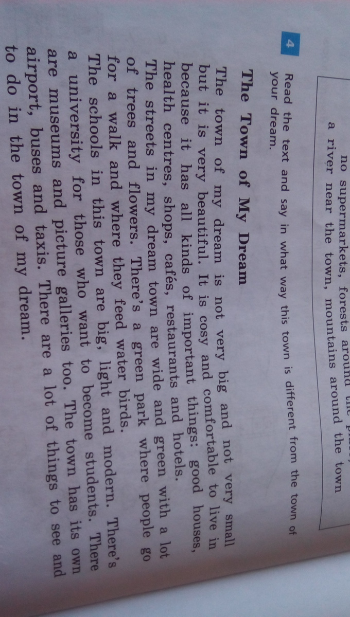 Город моей мечты не большой и не маленький,но очень красивый.Уютно и удобно жить в нем,потому что в нем есть все виды важных вещей:хорошие дома,центры здоровья,магазины,кафе,рестораны и отели.