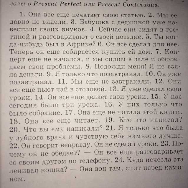 1. It still publishes his article. 2. We have not seen her. 3. The grandparents have to lead if his grandchildren. 4. Now they sit in roc- mud and talking about his trip. You da kor ever been to Africa? 6. He did everything for her. Now he's going to still buy her a house. 7. Cohn concerts has not started yet, and we're sitting hall dis give their problems. 8. Wait for me! I do not vzya- la money. 9. I just had breakfast. 10. He had already had breakfast. 11. We have not had breakfast. 12. They still drink tea in the dining room. 13. I have already done my homework. 14. He was still doing his lessons. 15. We have now had three lessons. 16. they have just had a meeting. 17. It has not yet read the book. 18. She was still reading. 19. Who wrote it? 20. What do you write it? 21. I have just been to the dentist and I feel much better than 22. It is not telling the truth. He did not do his homework. 23. Therefore what he did not dine? He was still talking to her friend on the phone 24. Where did ata lazy cat? She is there, asleep in front of Kami NOM.