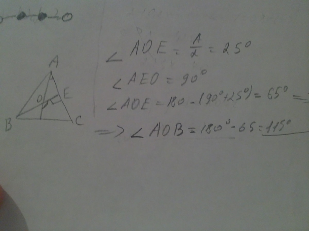 Угол А остроугольного треугольника =50 градусов.Найдите тупой угол ,под которым пересекаются биссектриса угла А и высота,опущенная из вершины В.Ответ 115,но нужен рисунок. Пжл срочно ребят!!!!!!!!!!