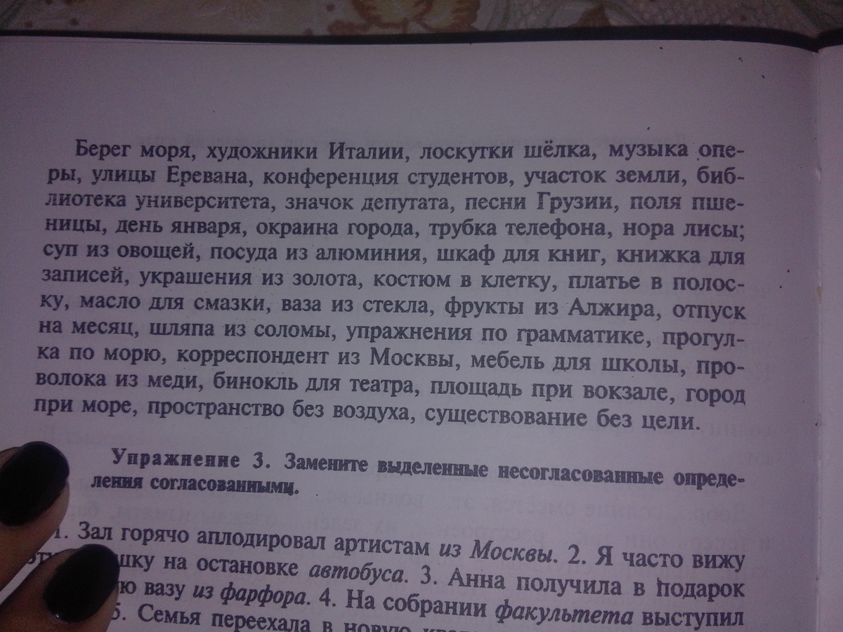 Морской берег, итальянские художники, шелковые лоскутки, оперная музыка, ереванские улицы, студенческая конференция, земельный участок, университетская библиотека, депутатский значок, грузинские песни, пшеничные поля, январский день, городская окраина, телефонная трубка, лисья нора, овощной суп, алюминиевая посуда, книжный шкаф, записная книжка, золотые украшения, клетчатый костюм, полосатое платье, масляная смазка, стеклянная ваза, алжирские фрукты, отпускной месяц, соломенная шляпа, грамматические упражнения, морская прогулка, московский корреспондент, школьная мебель, медная проволока, театральный бинокль, вокзальная площадь, безвоздушное пространство, бесцельное существование.