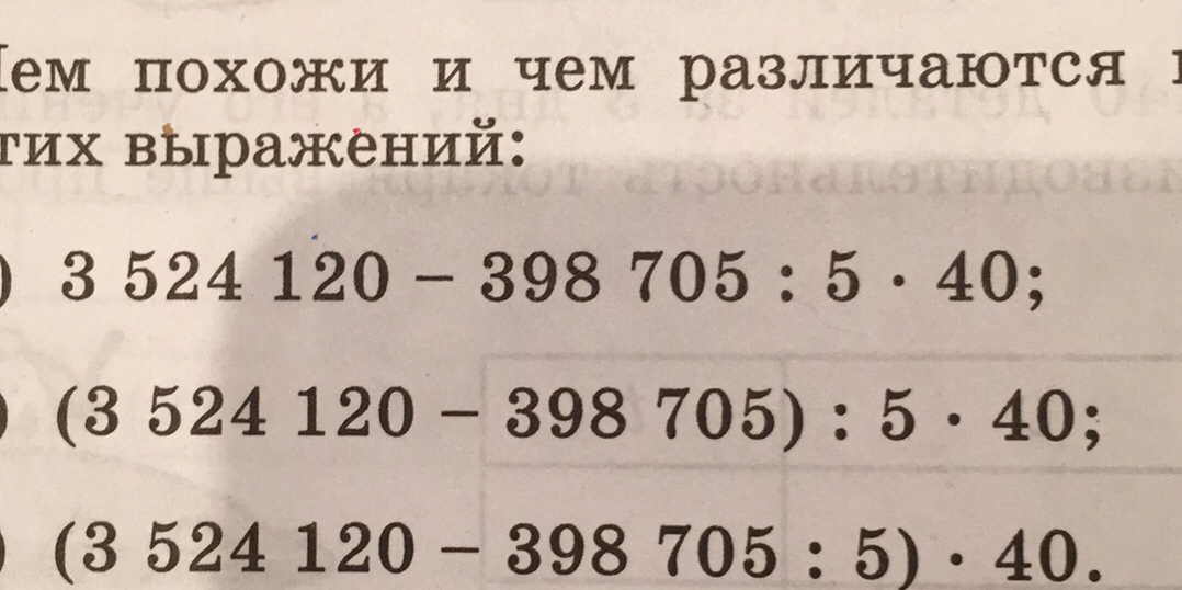 Сем похожи чем различаются 1 их выражении 524 120 - 398 705 : 5 - 40; › (3 524 120 — 398 5 - 40; › (3 524 120 — 398 705 : 5) о 40.