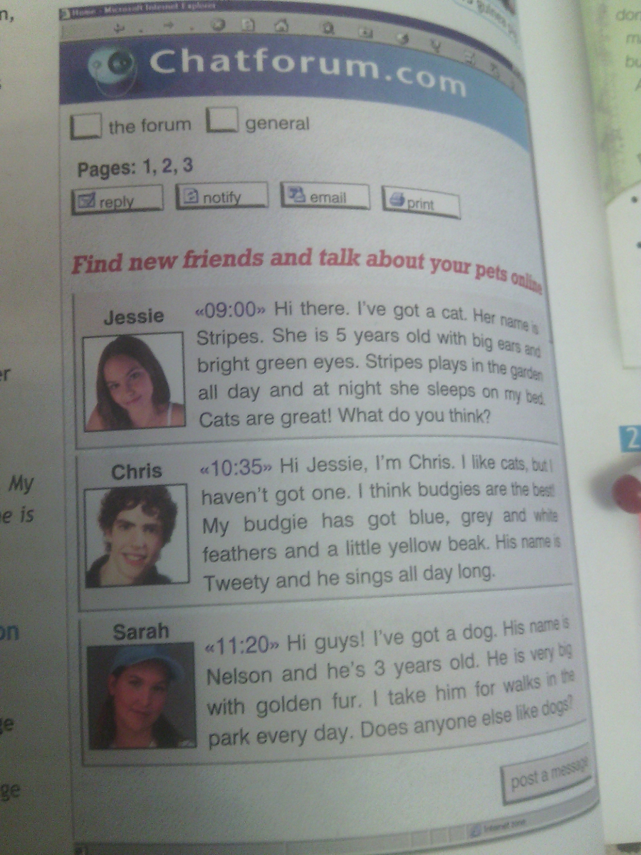 Крис <10:35> Привет, Джесси, я Крис. Я люблю кошек, но своей у меня нет. Я думаю, что попугайчики (волнистые) - лучшие! Мой - бело-сине-серый с жёлтым клювиком. Его зовут Tweety, и он поёт днями напролёт.