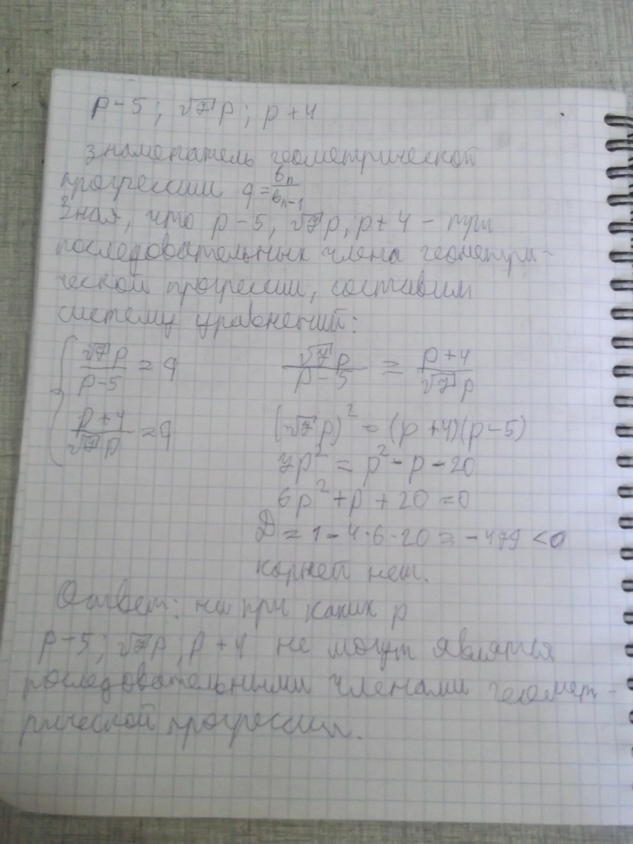 Найдите значение P,при котором числа p-5,√7p , p+4 являются тремя последовательными членами геометрической прогрессии