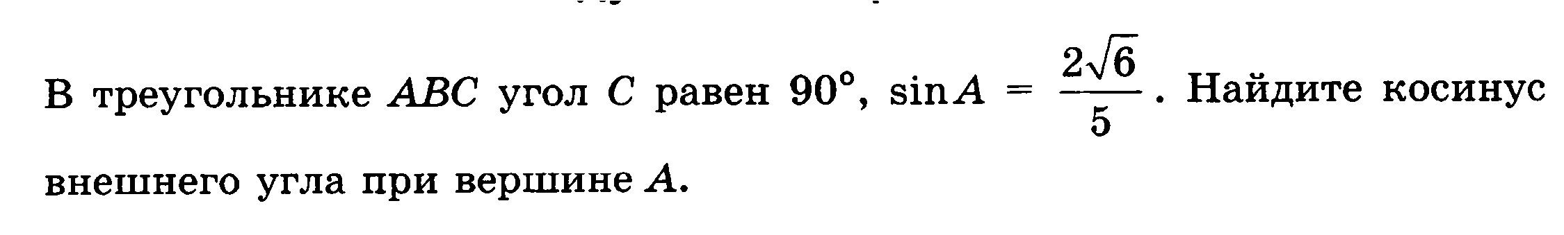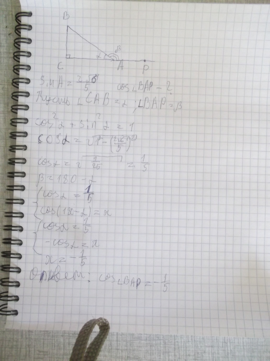 cos=1/5 т.кю угол тупой внешний угол при вершине равен 180-а значит косинус там отрицательный -1/5