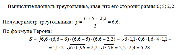 Помогите сделать номер по геометрии.Вычислите площадь треугольника,зная что его стороны равны:6 5 2,2