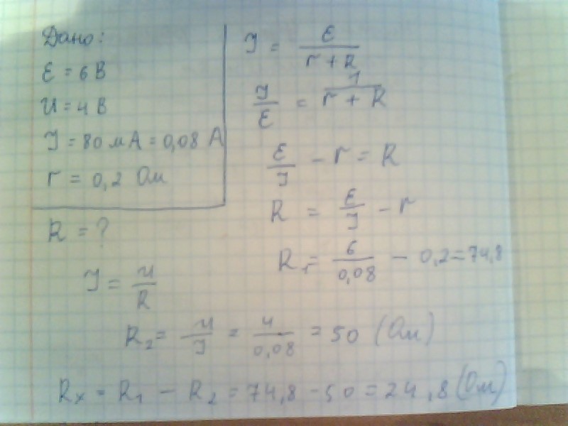 К источнику тока с Э.Д.С. 6В подсоединена электронная лампа. Для накала лампы необходимо напряжение 4В при силе тока 80мА. Внутреннее сопротивление источника тока 0,2 Ом. Определить величину дополнительного сопротивления, которое необходимо включить последовательно с нитью лампы во избежание ее перегрева