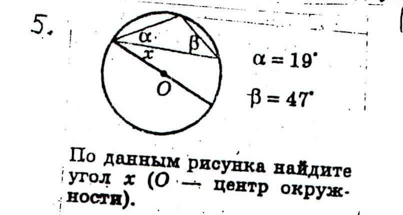 1)у=180-19-47=114, значит дуга, на которую он опирается равна 114*2=228