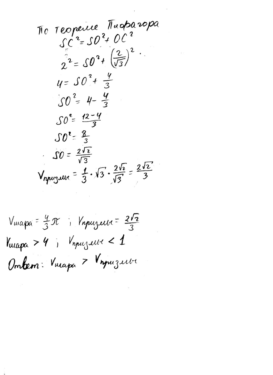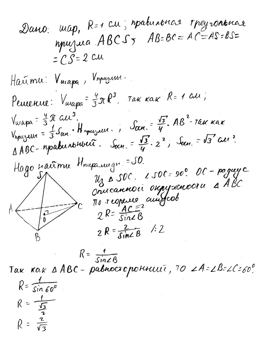 Какое тело имеет больший объем шар радиусом 1 см или правильно треугольная призма каждое ребро которой равно 2 см?