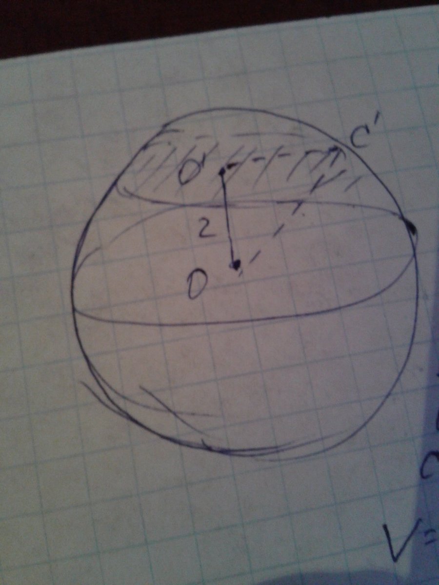 Sсеч =12П<br />ОО'=2<br />О'С'= r сеч<br />ОС'= R шара<br />V=4/3ПR^3<br />C'O=sqrt12=2*sqrt3<br />треуг.ОО'С - прямоугольный<br />С'О-гипотен.<br />С'О=sqrt (O'O^2+O'C'^2) = sqrt (4+12)=4<br />V=4/3*64=85 целых 1/3 П см^3