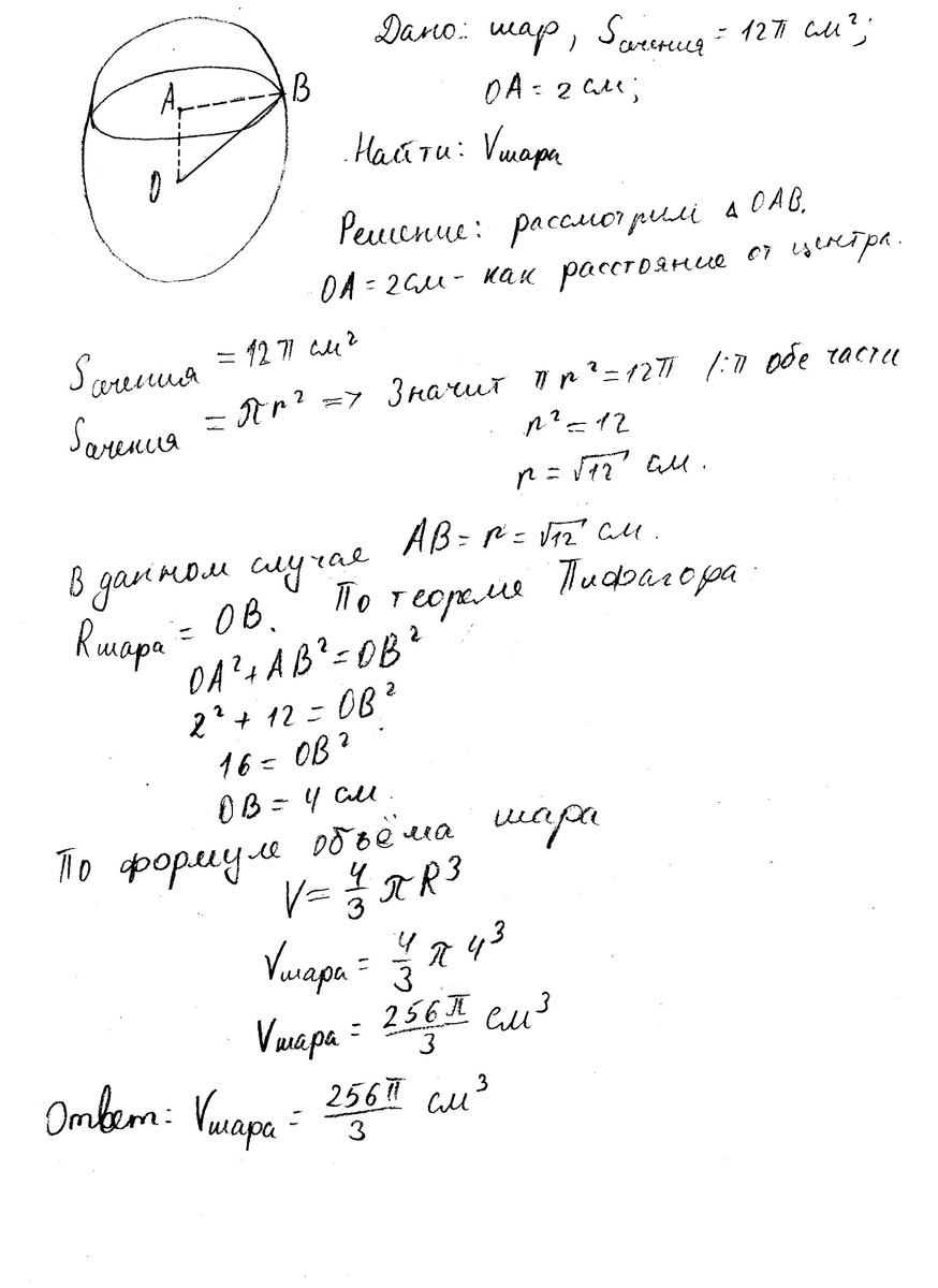 Сечение шара плоскостью удаленной от центра шара на расстояние 2 см имеет площадь 12 п см. найдите объем шара.