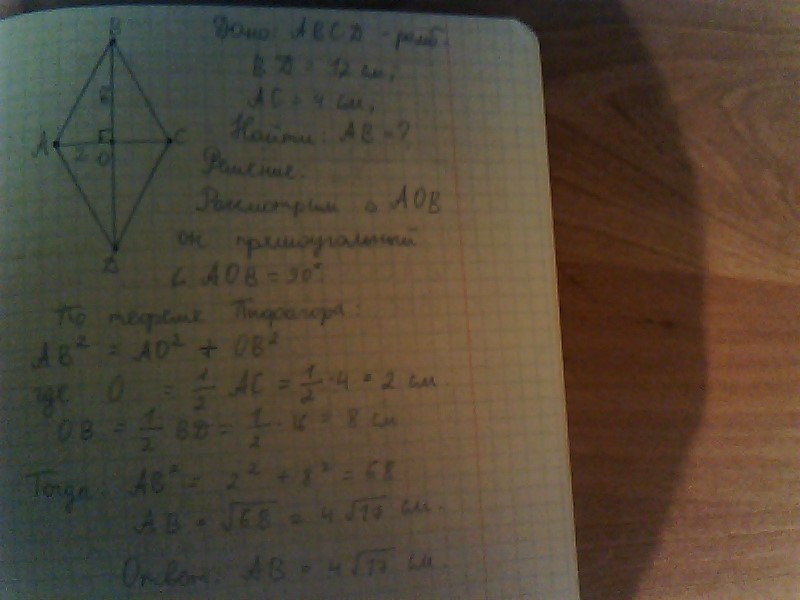 1. НАЙТИ СТОРОНУ РОМБА , ДИАГОНАЛИ КОТОРОГО КОТОРОГО РАВНО 12 И 4 СМ.