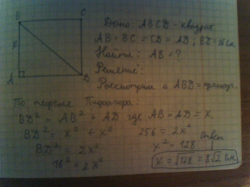 3. НАЙТИ СТОРОНУ КВАДРАТА, ДИАГОНАЛЬ КОТОРОГО - 16СМ.