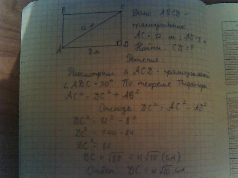 2. НАЙТИ НЕИЗВЕСНУЮ СТОРОНУ ПРЯМОУГОЛЬНИКА , диагональ которого равна 12М, ИЗВЕСНАЯ СТОРОНА - 8М.