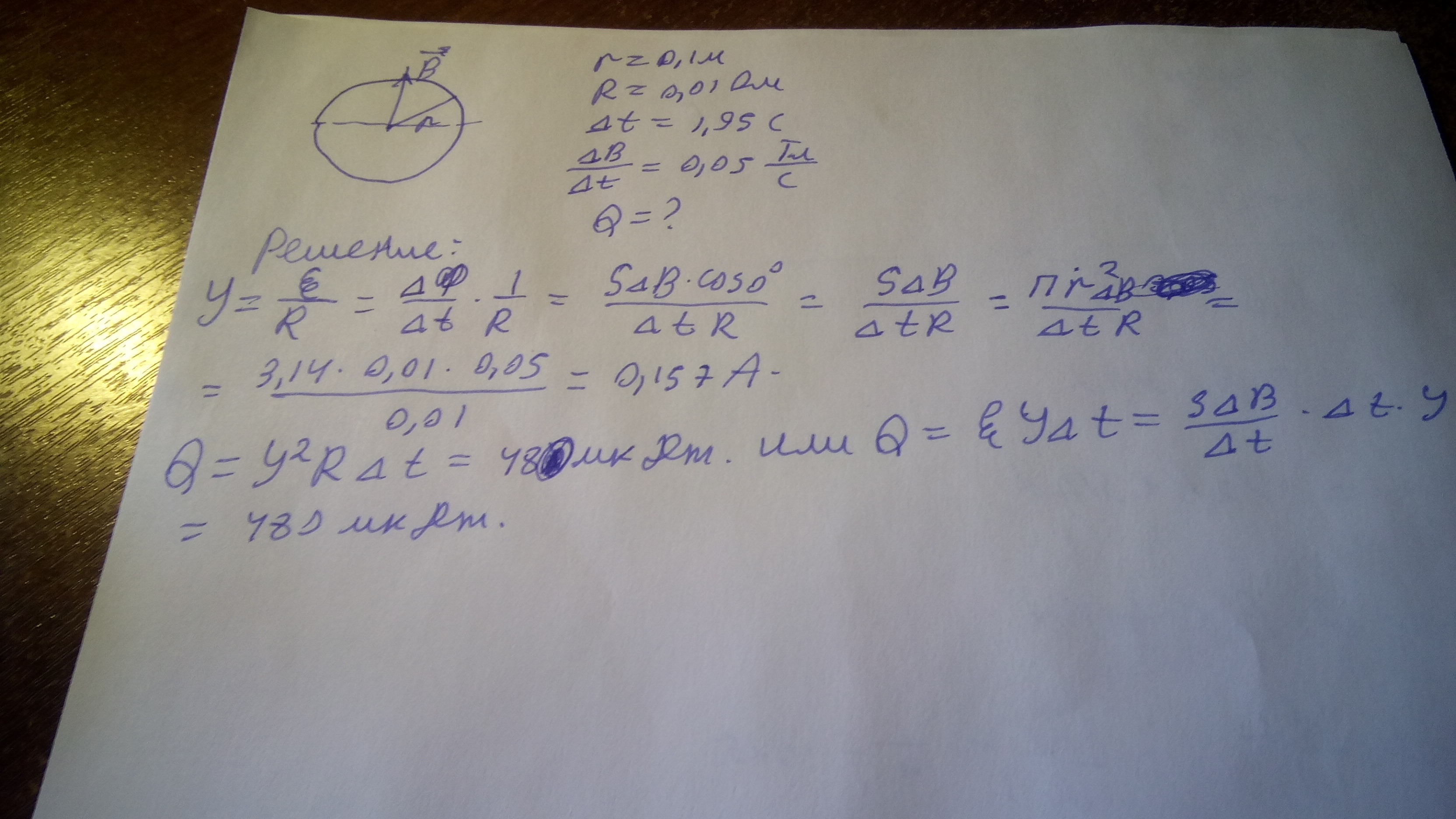 Кольцо радиуса 10 см из тонкой проволоки с сопротивлением 0,01 Ом находится в однородном магнитном поле, линии индукции которого перпендикулярны плоскости кольца. какое количество теплоты выделится в кольце за 1.95с, если магнитная индукция возрастает со скоростью 0.05 тл/с?