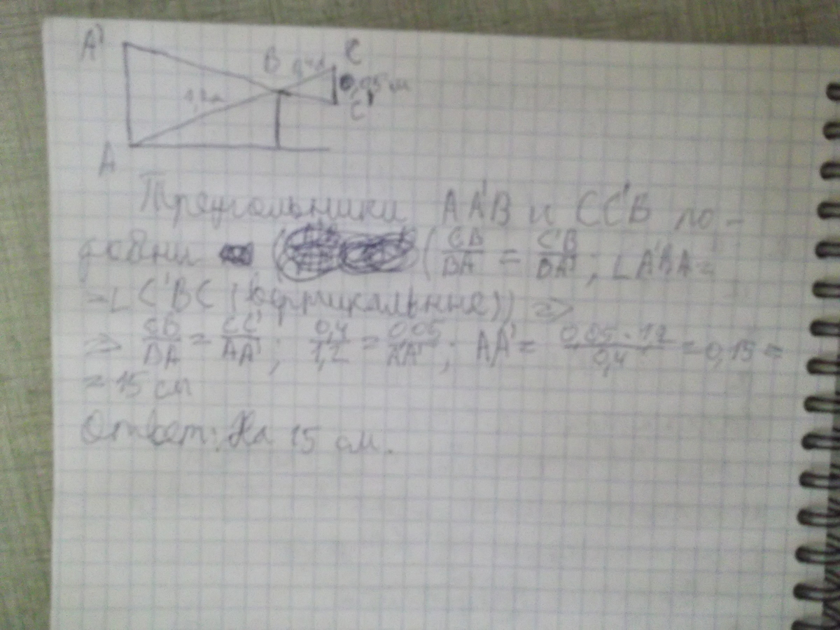 удочка закреплена на берегу с помощью двух креплений A и B,крепление B находится на расстоянии 40 см от одного конца удочки и 1,2 м от другого.На сколько поднимется длинный конец удочки ,если короткий опустить на 5 см?.Ответ дайте в см
