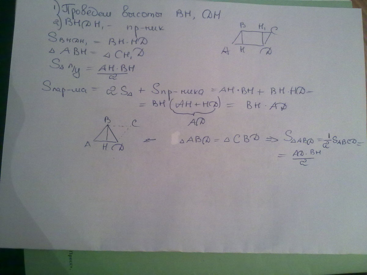 Площадь произвольного треугольника выводится через площадь параллелограмма.