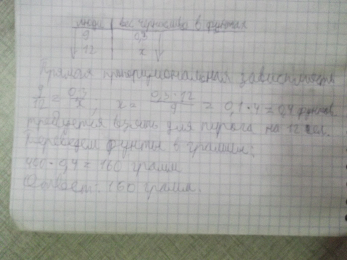 В книге Елены Молоховец «Подарок молодым хозяйкам» имеется рецепт пирога с черносливом. Для пирога на 9 человек следует взять 0,3 фунта чернослива. Сколько граммов чернослива следует взять для пирога, рассчитанного на 12 человек? Считайте, что 1 фунт равен 0,4 кг.