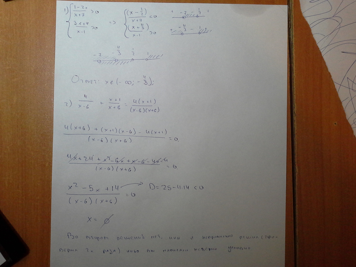 При каких значениях х значения дробей 1-2х/ x+7 и 3х+4/x- являются противоположными числами? 2)При каких значениях х сумма дробей 4/x-6 и Х+1 / X+6.